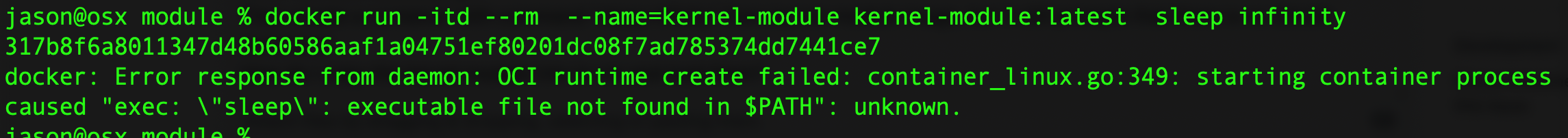 Then create a container with command "sleep infinity" from kernel-module image, but it still prompts that there is no sleep command: