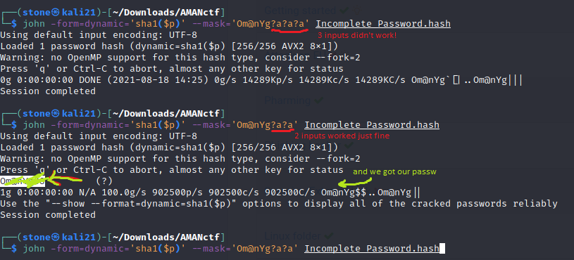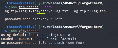 We can see the passw of the .zip folder in the middle of the output, and if buy mistake you closed the terminal, no worries coz this John stores his cracked stuff in a safe place, just use his patterns such as --show to reveal them again without cracking again.