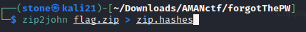 Now we move on.. John has active passw cracking tools to brute force archives such as .zip and .rar folders, so we gonna use zip2john tool to get the pw of the given zip folder: