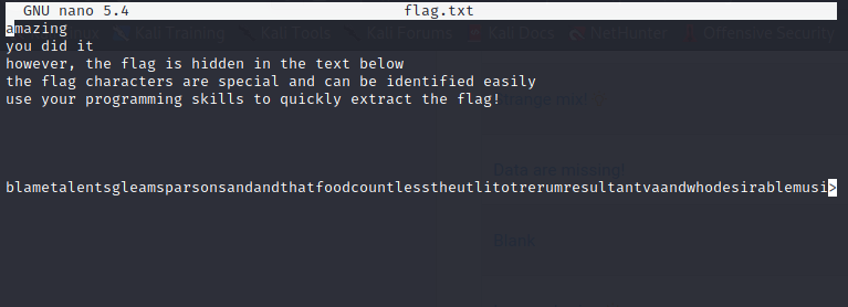 as seeen, the 9th line of the file has a looooong string, and it asks you to pull out the "special characters" since they form up the final flag!