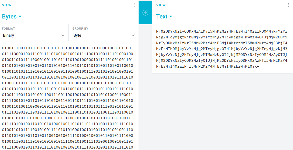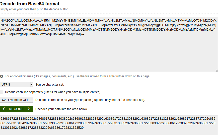 as we see in the right side of this online tool (the plain text side), the binary was decoded to give us another unreadable text, this text seems to be encoded with base64 (you will get used to the different types of encryptions with time as you go by solving many CTFs, but if you want an easy tip, just copy and paste the encoded text on google and it mostly gives you a hint in the google results on the encoding method used for your text). Moving on, I decrypt the base64 text using another online tool just to make sure: https://www.base64decode.org/