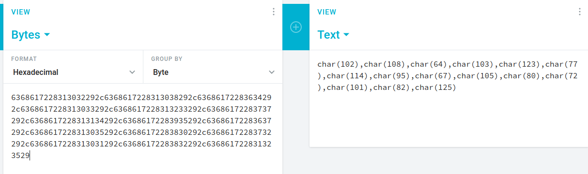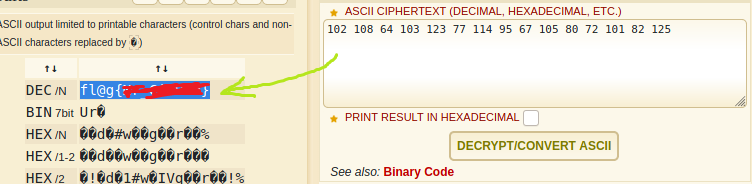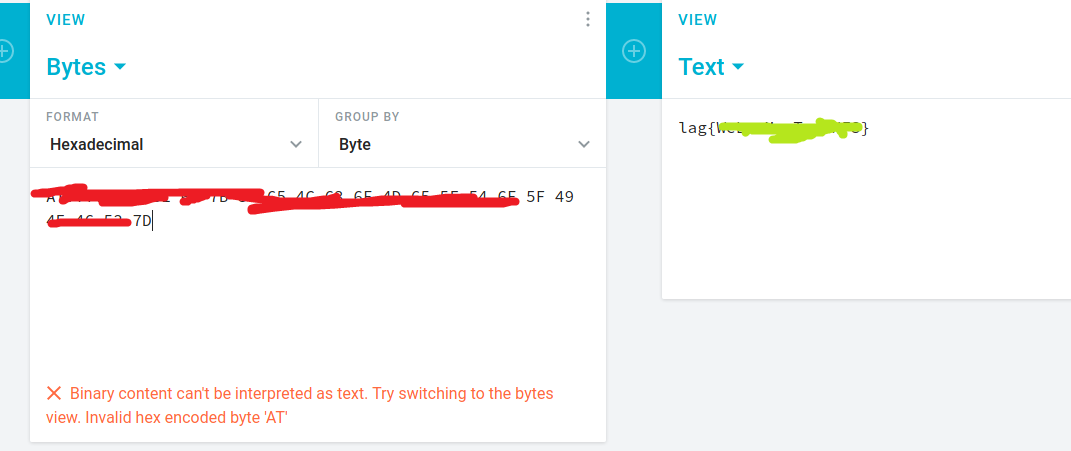 as seen in the output down in the pic, this time we have a long sequence of digits and some letters they look like sha1 or some similar thing but not really. playing and trying around on them using the 1st online tool that I used, it turned out it's in hexadecimal, so: