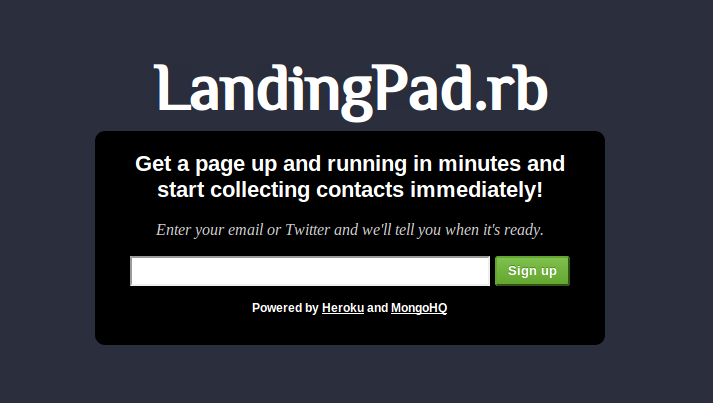 LandingPad.rb is a simple "landing page" application that takes just a few minutes to setup. It lets you quickly put up a page to collect email addresses or Twitter users for when you are ready to launch your app/product/whatever.