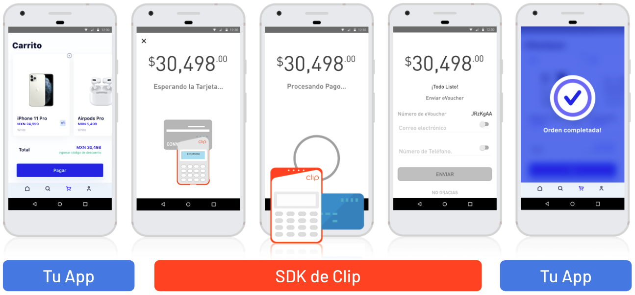 - Integra las librerías de Clip para tomar pagos con tarjeta, las pantallas de flujo ya están predefinidas