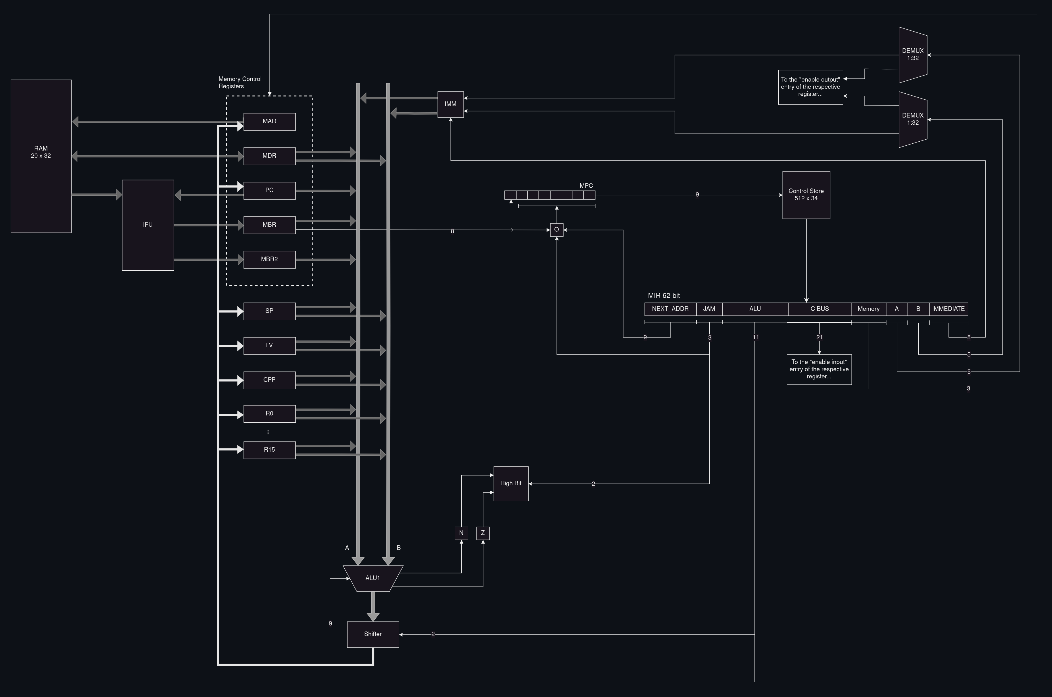 The way that each datapath is structured is not far from the usual three-bus design plus a IFU, the techniques involved a rather simple for now as you can see the diagram below: