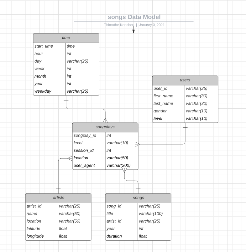 A compagny that has been collecting songs' data and users activity wants an efficient model to store and analyze the data. The data currently resides in folders in JSON format. This project consists of creating a database and build an ETL pipeline to store the data. This will help the analytics to analyze and derive insights from data.