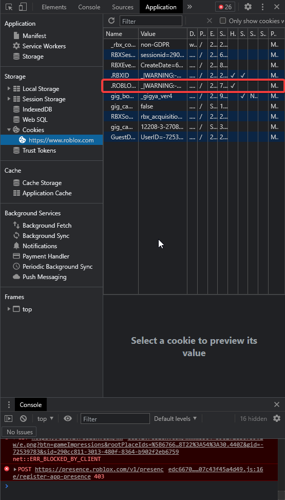 Open this account in a new Google Chrome profile. Logging out invalidates the COOKIE. To get the cookie, you need to inspect your Roblox page and head to the Application tab. You will find a .ROBLOSECURITY. Copy the whole thing. You can close the window, but never click the Log Out button.