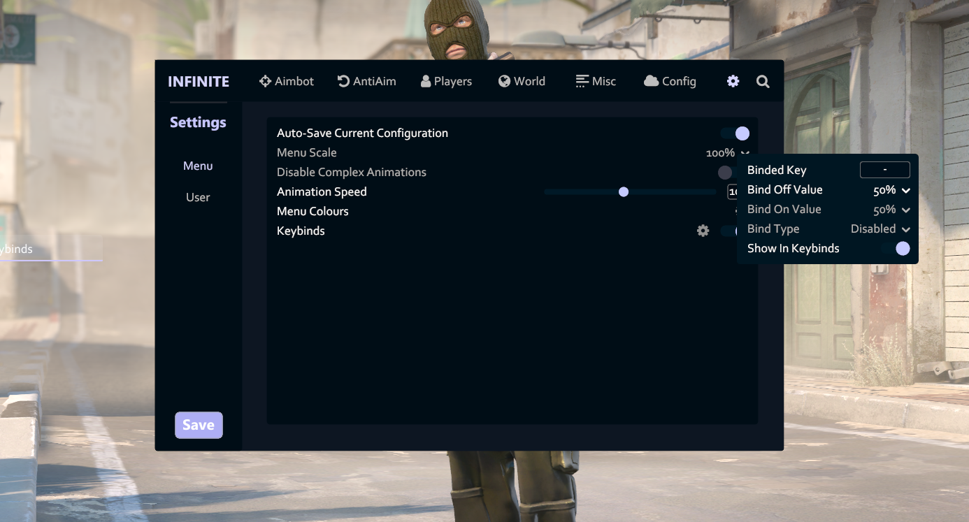 This source has quite the sentimental value to me as it was my hobby during my early teen years to create these cheats. The GUI is very well made and a bit inspired by Neverlose, and has similar binding features to it, albeit the terrible implementation I did.