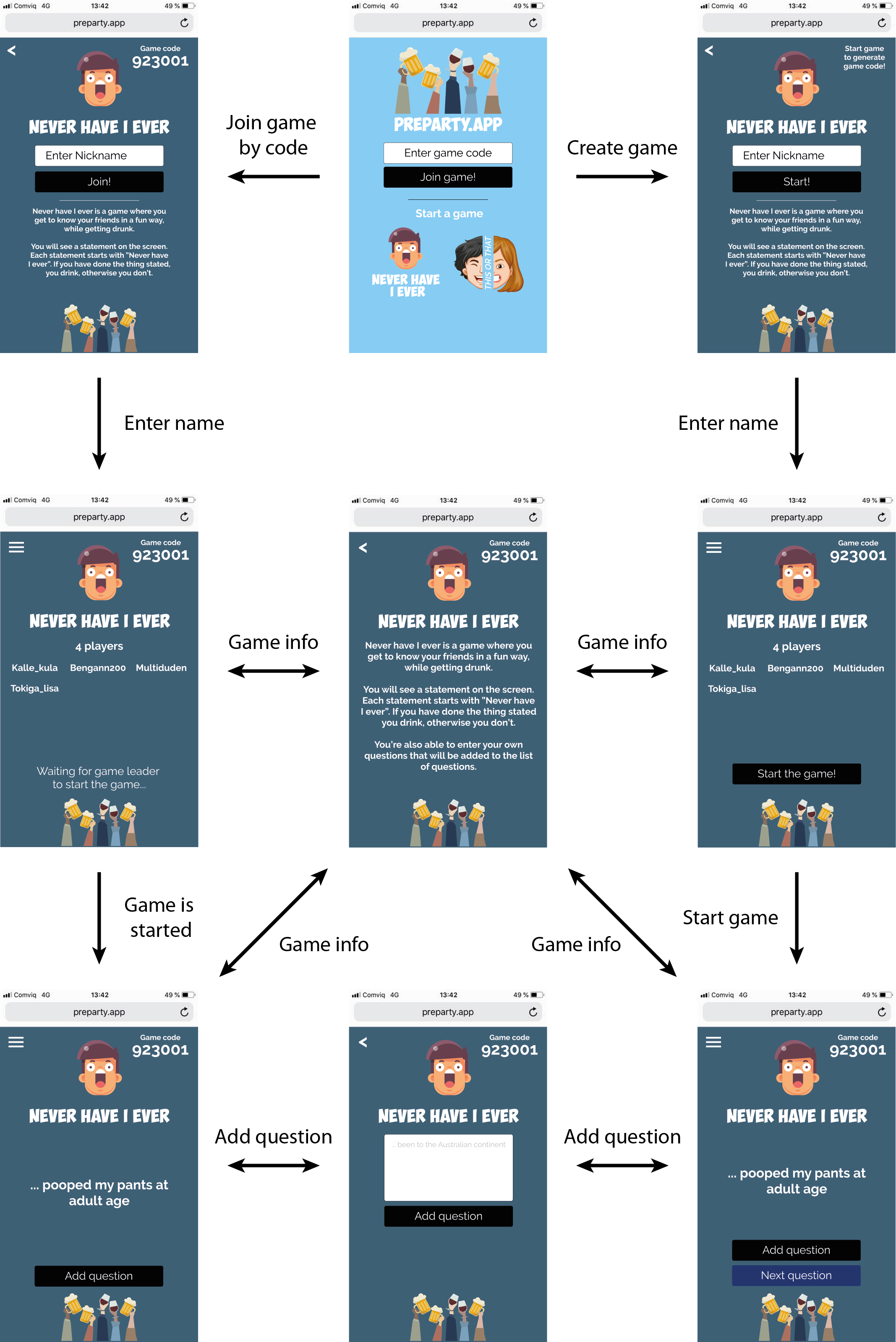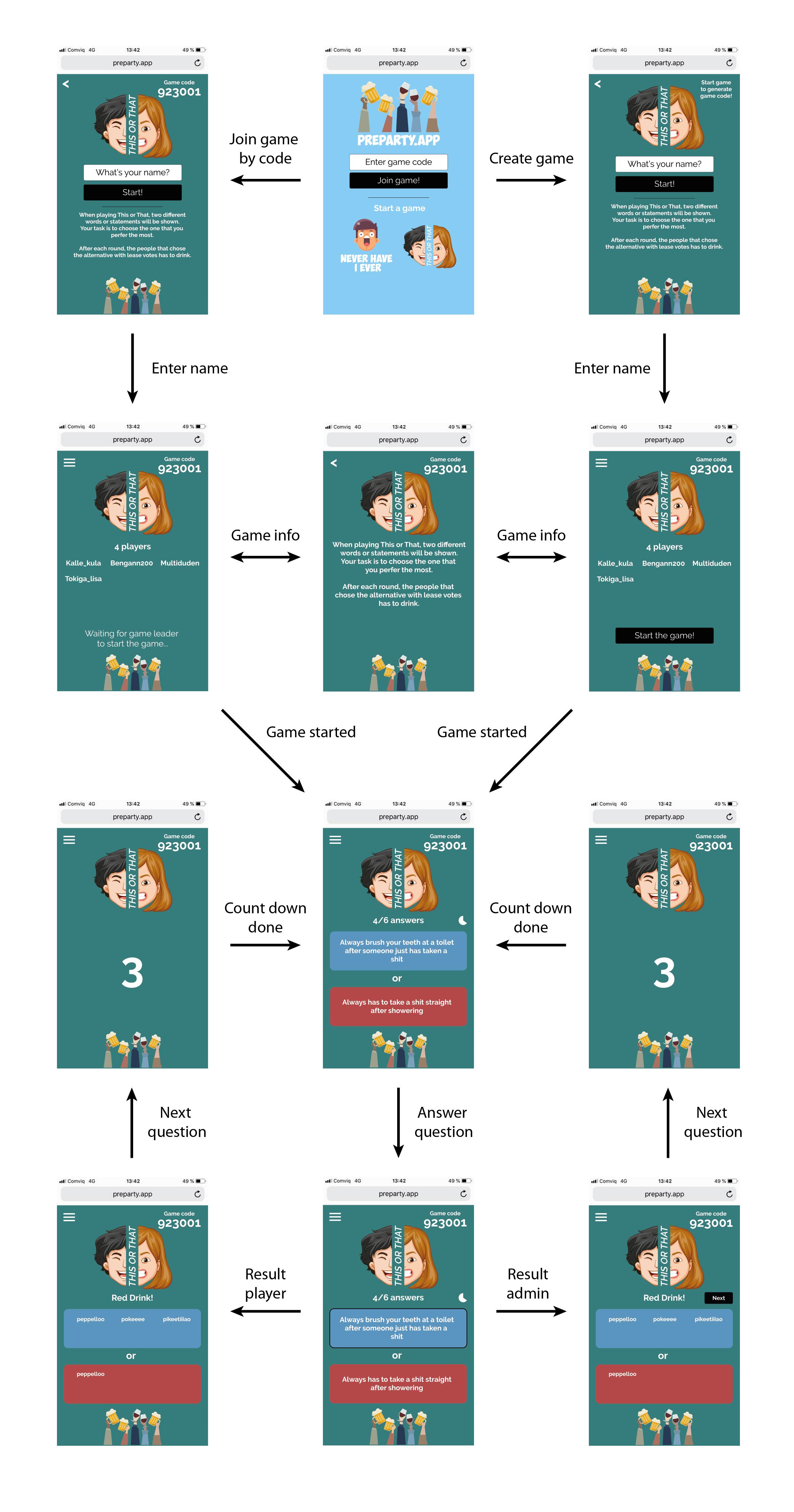 preparty.app preparty.app is a web-based game platform that lets users create, join and play games that are suited for pre-parties. Workflow Never Have I Ever This or That Technical specification Angular Firebase database Firebase functions