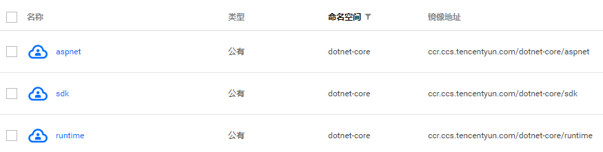 本人在腾讯云中已公开ccr.ccs.tencentyun.com/dotnet-core/命名空间保存相关images