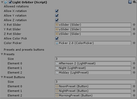 There's a support for light presets also. To create a preset, go to Assets -> Create -> Light Orbiter -> Preset. This will create a Preset object in your project explorer. Select the object and the inspector should look something like this: