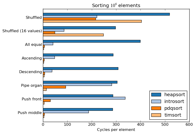 pdqsort and timsort with various input distributions: