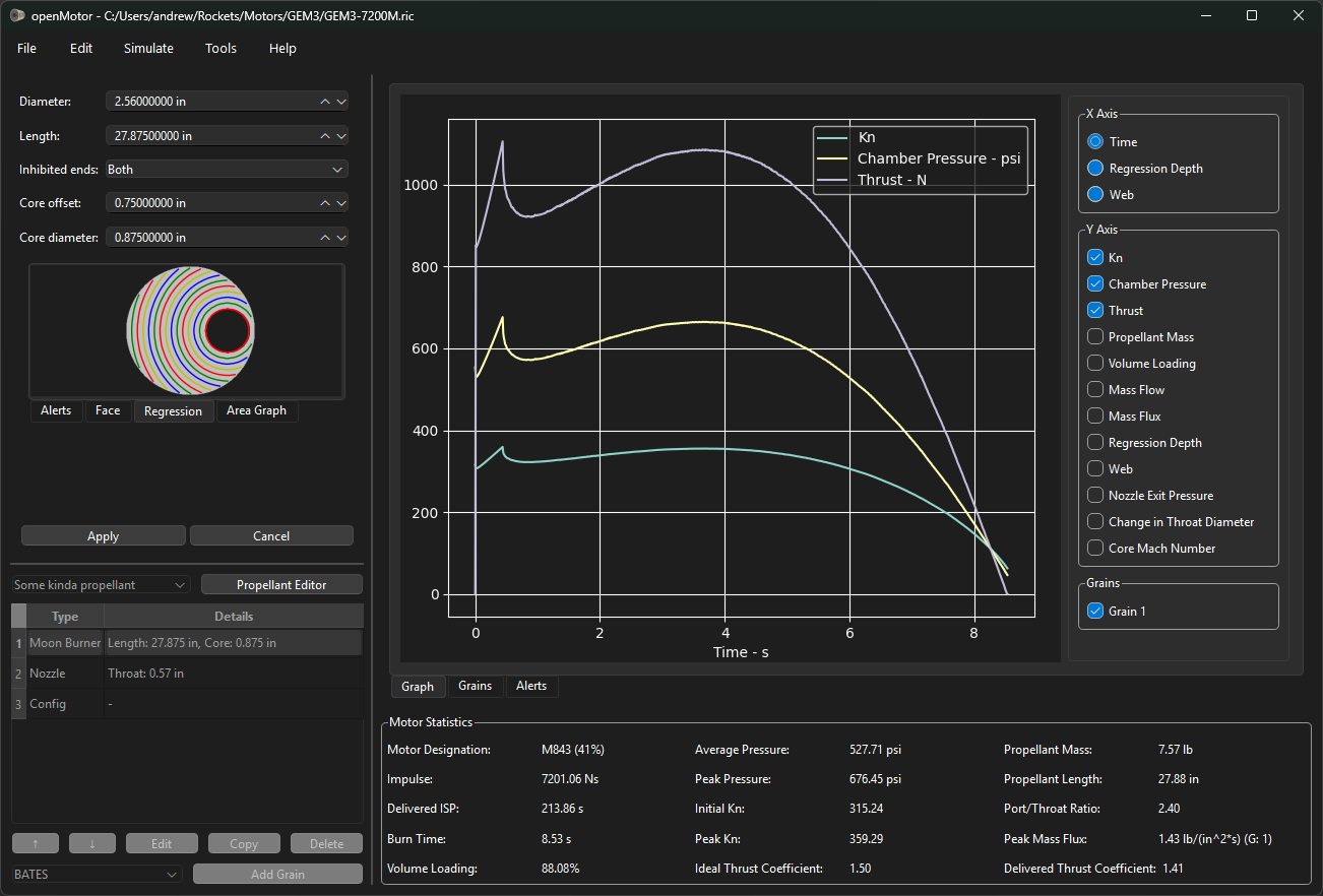 openMotor is an open-source internal ballistics simulator for rocket motor experimenters. The software estimates a rocket motor's chamber pressure and thrust based on propellant properties, grain geometry, and nozzle specifications. It uses the Fast Marching Method to determine how a propellant grain regresses, which allows the use of arbitrary core geometries.