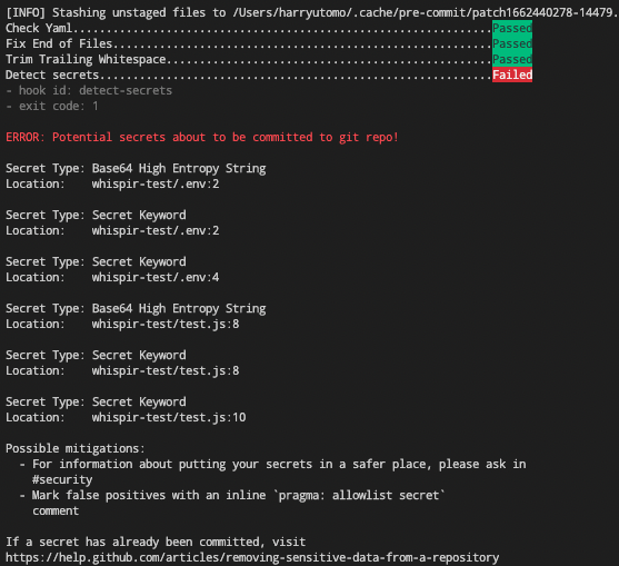 .pre-commit-config.yamlfile which performs a pre-commit hook to performdetect-secrets.This will prevent from developers to accidentally committing code changes with potential secrets in itPlease run