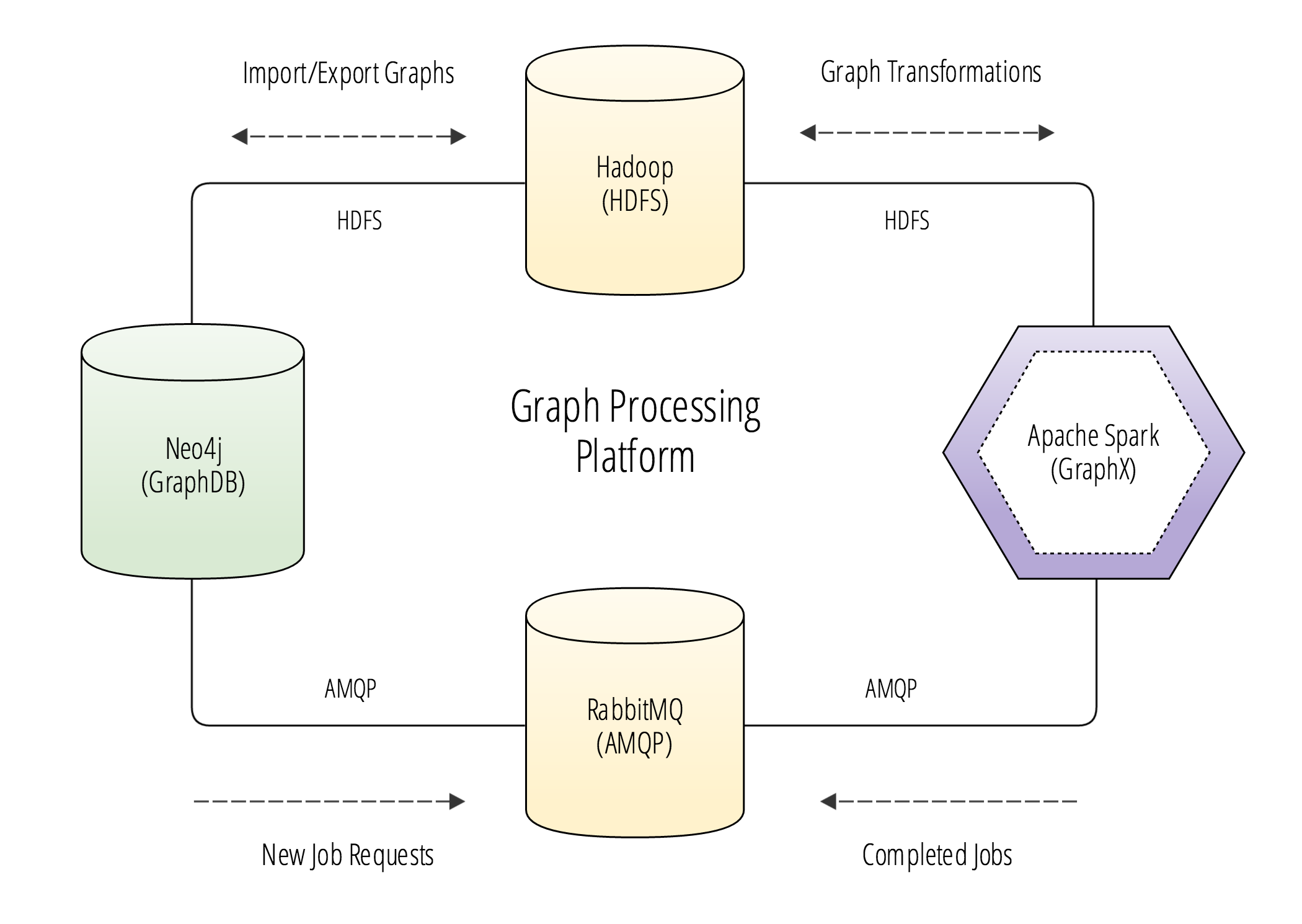 We can see from the diagram that new job requests are sent from Neo4j to RabbitMQ. Before Neo4j sends a message to RabbitMQ requesting a new job, it will export a graph replica to HDFS. The analysis service, which is the hexagon that is colored in purple, has an embedded standalone instance of Apache Spark, and will listen for messages from RabbitMQ containing new job requests. Each message that is received by the analysis service contains information about where the exported graph replica is stored on HDFS and what graph algorithm to execute.