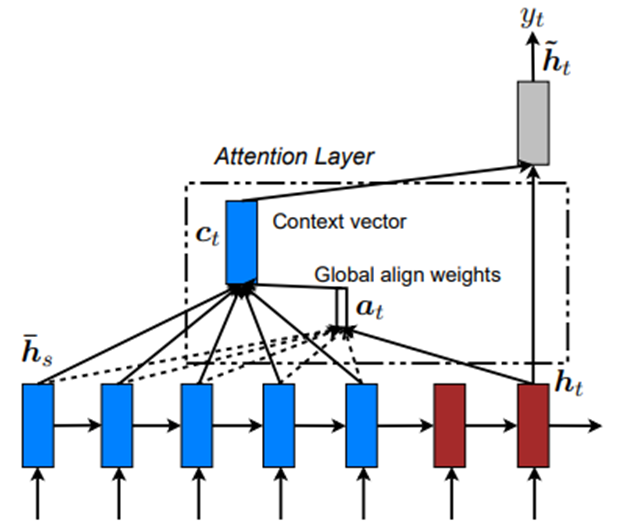 Local과 달리 encoder에 넣어 준 단어 전체에 대해, 즉 모든 time step의 hidden을 고려하여 context vector를 계산합니다. -