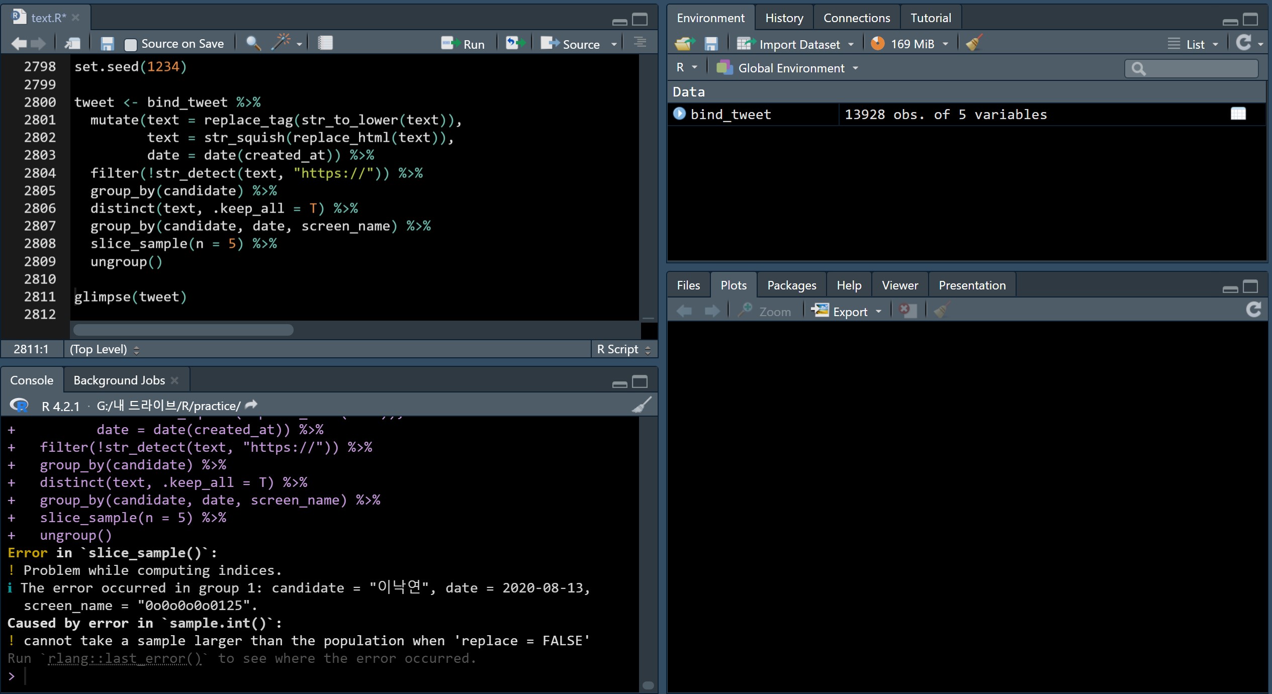 책에 나온 그대로 입력했는데, 콘솔창에 있는 것처럼 에러가 나와요. slice_sample(n = 5)이라고 된 부분에서 뭔가 문제가 발생한 것 같은데 전혀 이유를 모르겠어요. 선생님, 고수님들, 해결방법 좀 알려주세요.