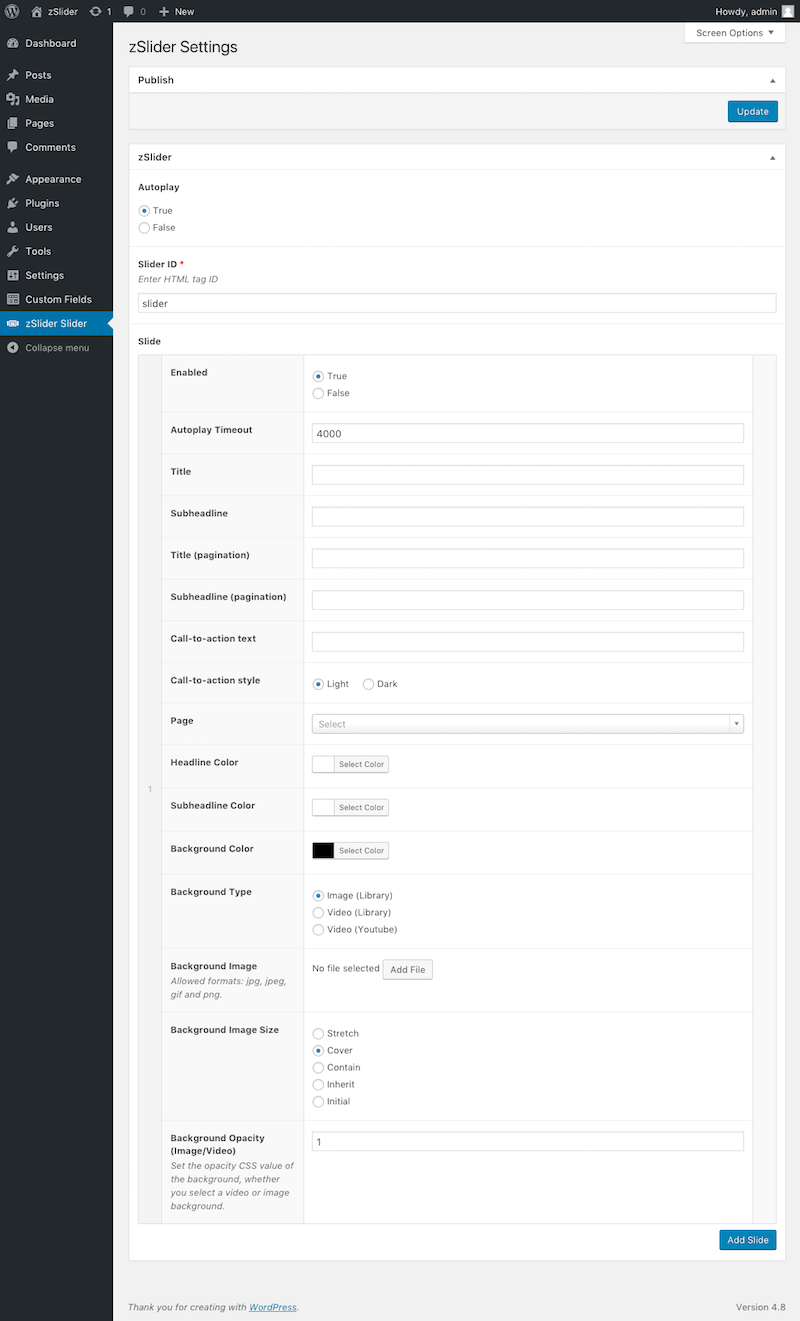 acf-zSlider.jsonusing the ACF. - Add the ACF Options WP admin menu item by adding the below code to your themes