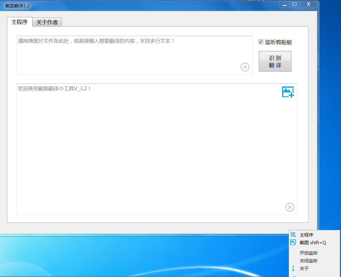快捷键shift+q,文本识别,自动识别中英文,翻译功能调用百度接口! - 可监听剪贴板,支持其他第三方任意截屏软件,截屏至剪贴板即可自动翻译!支持系统小托盘图标!